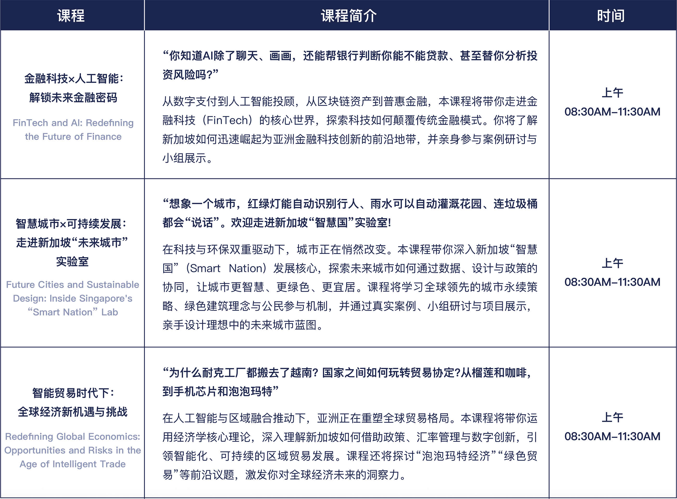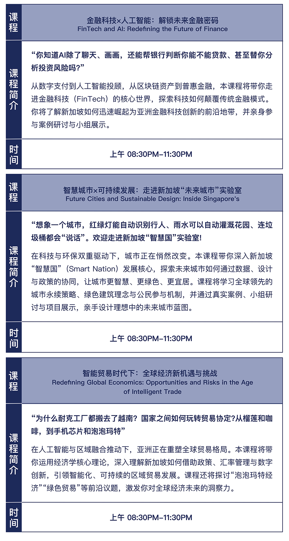 “狮城讲堂”研修项目涵盖专业的专题课程学术研习、企业参访和文化活动,由商科经济、人工智能、企业可持续发展等多个现代化热门学科领域组成,旨在拓展学生多元化的教育经历&提高个人综合学术能力和竞争力。